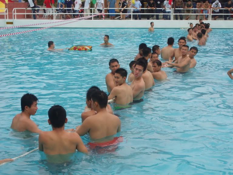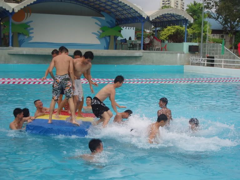 the first game, the guys had to balance on the float, the team that gets the most people up there wins. But it seems like everyone starts losing their balance after they get up...